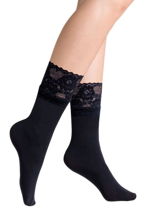 Grubszy, kryjący materiał tuż nad kostką spotyka się z koronkowym wykończeniem, które nie tylko pięknie prezentuje się na nagiej skórze, ale także pozwoli utrzymać skarpetki na właściwym miejscu przez cały okres użytkowania.