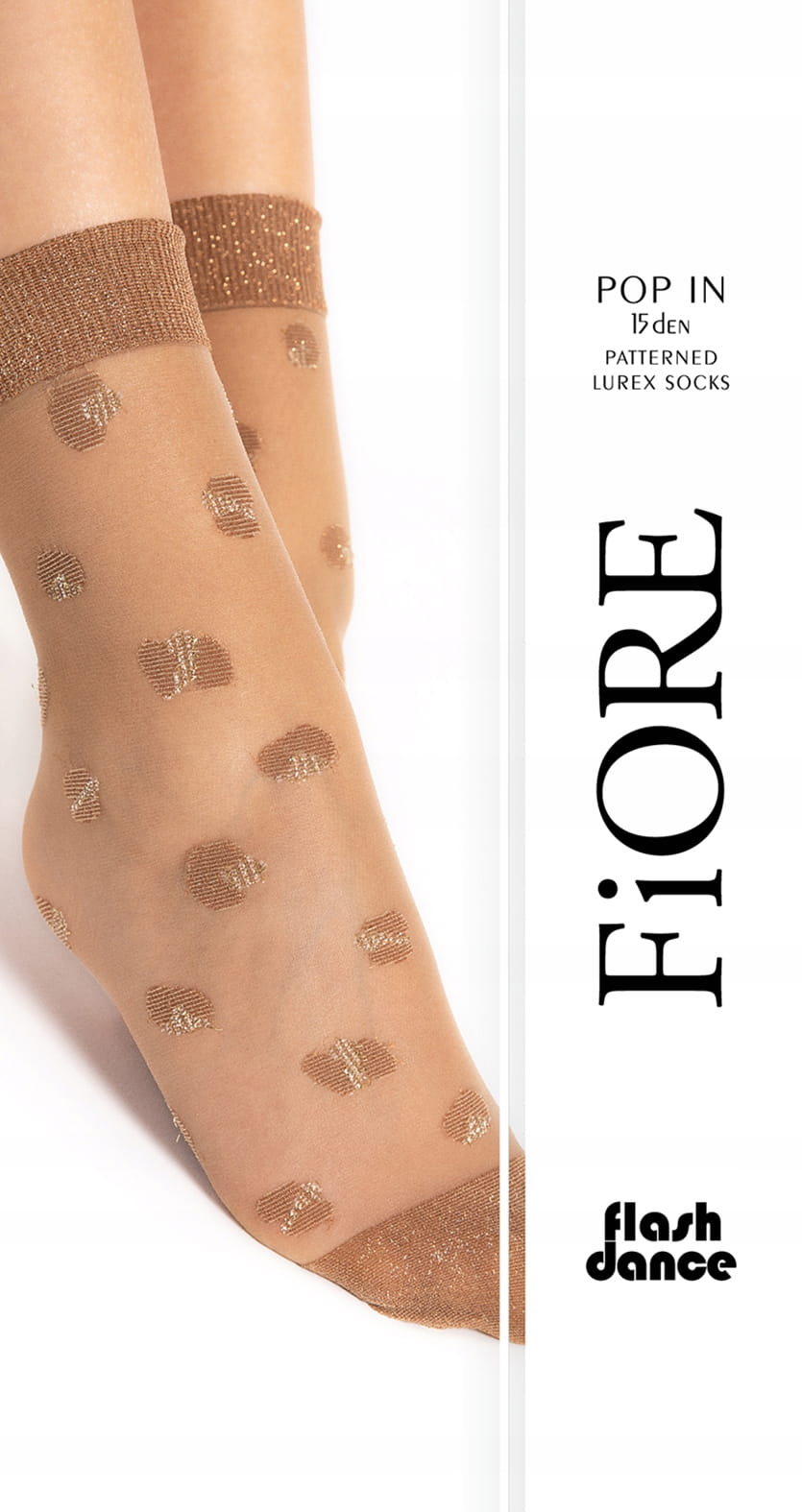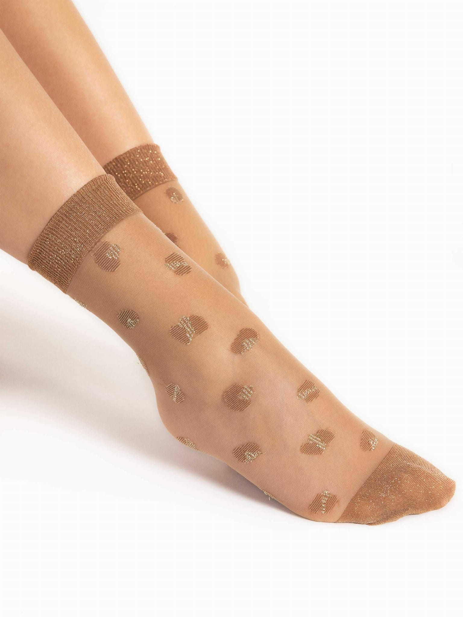 W upalne dni warto założyć lekkie, złociste skarpetki z subtelnym akcentem miedzi. Delikatnie połyskujące wzory, przeplecione nitką lureksową, tworzą niezwykły efekt – lśnią w słońcu i subtelnie opalizują na skórze.